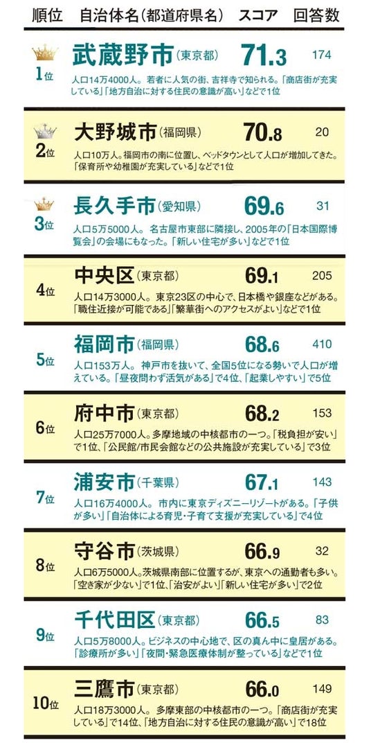 日経ビジネスと日経BP総合研究所が働く世代2万人を対象にした調査から、「活力のある都市ランキング」が作成されました。これによると上位10位の内、7つが都市部の一都三県に集中していることがわかります。
