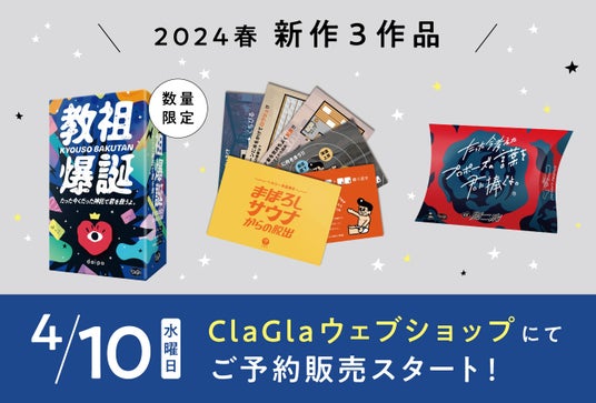 札幌市にあるボードゲーム・謎解きゲームのメーカーClaGla(株式会社クラグラ)は、4/10(水)10:00より、ClaGlaウェブショップにて新作ゲーム3作品の予約販売を開始いたします。