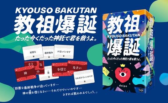 SNSで話題沸騰中の神のお告げを即興で作るワードパーティゲーム『教祖爆誕 たった今くだった神託で君を救うよ。(以下 教祖爆誕)』をはじめ、サウナが舞台の謎解きゲーム『ヘルシー系謎解き まぼろしサウナからの脱出』、大人気シリーズ『たった今考えたプロポーズの言葉を君に捧ぐよ。』の新作ミニ拡張『for 厨二病』がご予約いただけます。