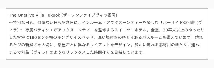 公式ホームページ:https://onefivehotels.co.jp/hotels/theonefivevillafukuoka