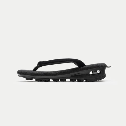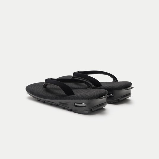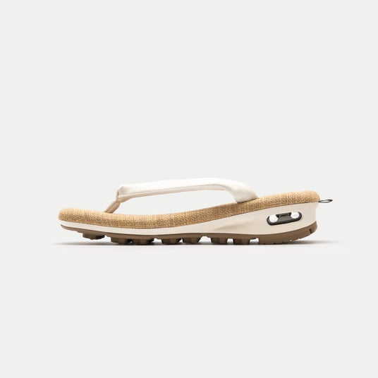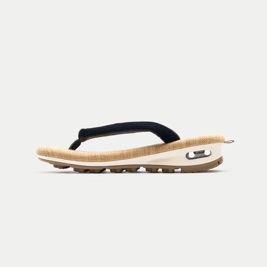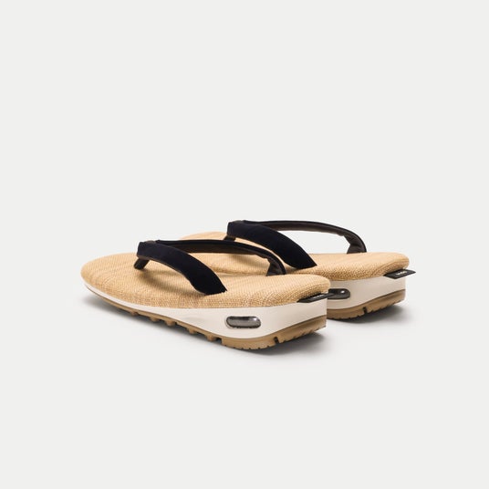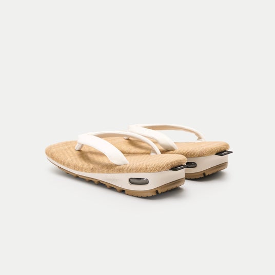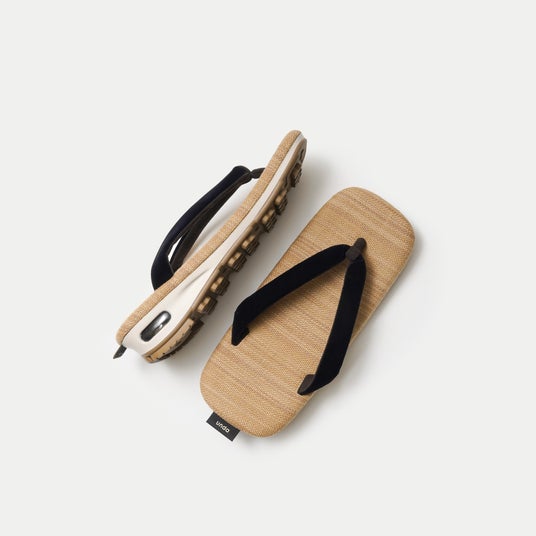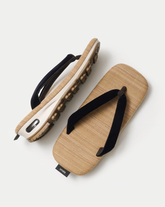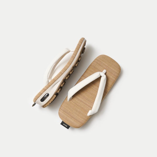耐水性向上。鼻緒とフットベッドの連結部分の隙間を最小限に縮小。そして「unda-雲駄-」を構成するパーツの接合を高い圧力で接着することにより、内部まで外の水分が浸透しづらい仕様に。