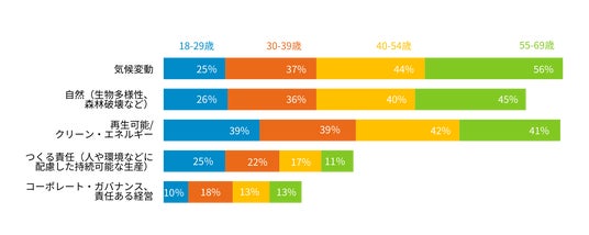 ・ 社会課題の一番の関心事は昨年に続き気候変動、若年層では再生可能エネルギーがトップ