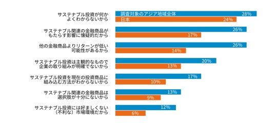 アジア太平洋地域の個人投資家は、平均すると、来年ポートフォリオの17%をサステナブル投資に当てることを考えていることがわかりました。サステナブル投資をしない理由について、「サステナブル投資が何かよくわからない」と回答した人の割合は、地域全体では前回調査の32%から28%に、日本でも37%から24%に減少しており、サステナブル投資が浸透してきたことが読み取れます。また、「サステナブル関連の金融商品がもたらす影響に懐疑的」や「他の金融商品よりリターンが低い可能性がある」などの懸念が、サステナブル投資への関心を高めるための障壁となっていることがわかりました。