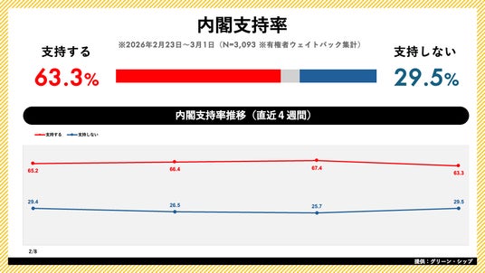高市内閣の支持率は63.3%(前週比-4.1pt)となりました。