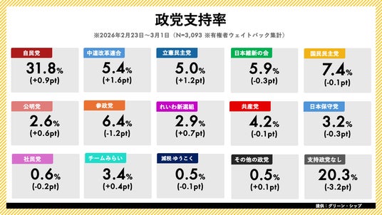 ジャッグジャパン株式会社(本社:東京都渋谷区)は、株式会社グリーン・シップ(本社:東京都千代田区)と業務提携し、グリーン・シップが提供する日次世論調査「世論レーダー」のデータを提供しております。本日、2026年3月第1週(2月23日~3月1日分)の内閣支持率・政党支持率調査の結果を発表いたします。