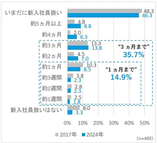 いまだに新入社員扱い」と感じている人は46.3%で、2017年の48.3%とほぼ同水準です。一方で、最初から「新入社員扱いはない」と感じている人は3.3%とごく少数で、新入社員として一定期間は失敗を許容される環境があることが分かります。