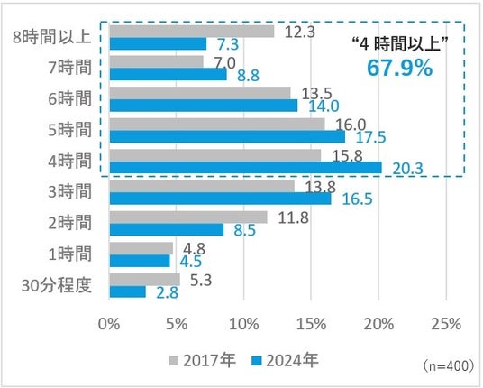 「4時間」が最も多く、20.3%を占めています。これは2017年の15.8%から増加しており、集中力を持続できる時間が長くなっていることが伺えます。「5時間」(17.5%)や「6時間」(14.0%)も多く、全体として“4時間以上”の集中時間を確保できている社員が多いようです。