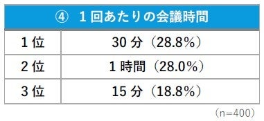 会議時間は、「30分」(28.8%)と「1時間」(28.0%)が多く、効率的な会議を求める傾向が強いことが分かります。「15分」(18.8%)も支持されており、“30分以内”の短時間での会議を好む人が半数近く(47.6%)に達しました。