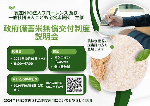 このたび認定NPO法人フローレンス及び一般社団法人こども宅食応援団では、全国各地のこども宅食等の支援活動に取り組む皆さまを対象に、「農林水産省・政府備蓄米の無償交付制度」に関するオンライン説明会を開催いたします。