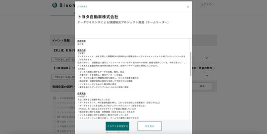事業内容:大手企業特化型の転職/キャリア採用プロダクト「Bloomキャリア登録」の開発・提供