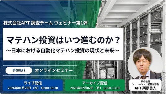 物流システムエンジニアリングを手掛ける株式会社APT(本社:千葉県千葉市、代表取締役社長:井上 良太、以下 APT)は、2026年1月29日(木)に、オンラインセミナー「マテハン投資はいつ進むのか? 日本における自動化マテハン投資の現状と未来」を開催いたします。