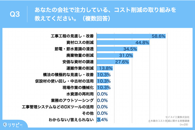 Q1で「かなりできている」「ややできている」と回答した方に、「Q3.あなたの会社で注力している、コスト削減の取り組みを教えてください。(複数回答)」(n=29)と質問したところ、「工事工程の見直し・改善」が58.6%、「資材ロスの削減」が44.8%、「節電・節水意識の浸透」が34.5%という回答となりました。