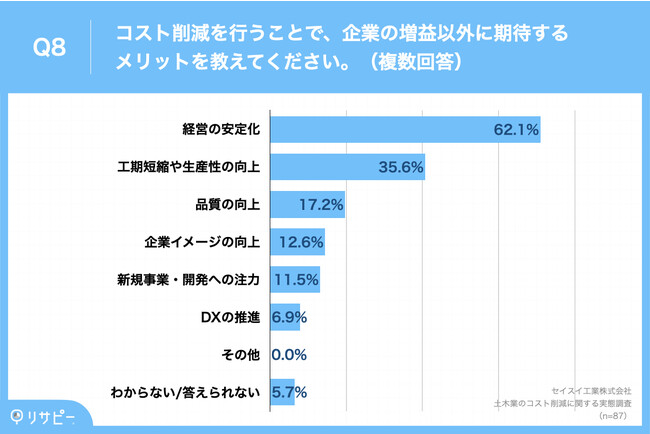 「Q8.コスト削減を行うことで、企業の増益以外に期待するメリットを教えてください。(複数回答)」(n=87)と質問したところ、「経営の安定化」が62.1%、「工期短縮や生産性の向上」が35.6%、「品質の向上」が17.2%という回答となりました。