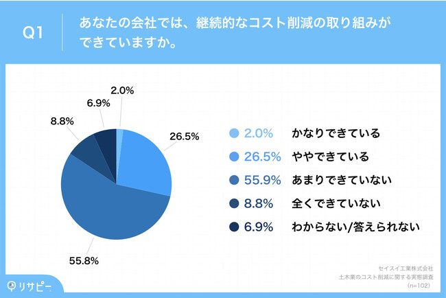 「Q1.あなたの会社では、継続的なコスト削減の取り組みができていますか。」(n=102)と質問したところ、「あまりできていない」が55.9%、「全くできていない」が8.8%という回答となりました。