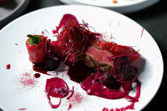 ・牛フィレ肉のグリル ビーツのヴァリエーション(コンフィ、山葵風味のピューレ、チップ、