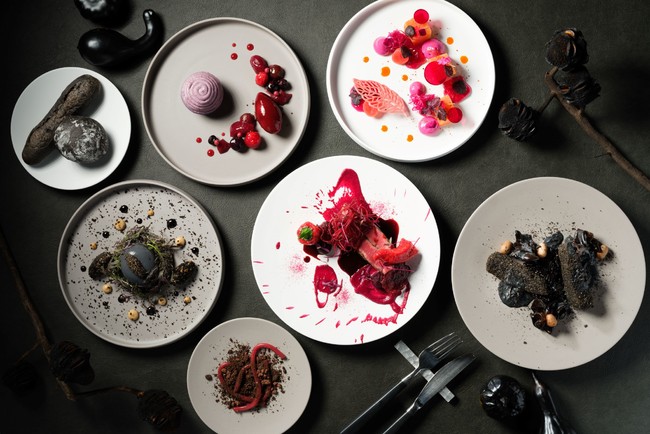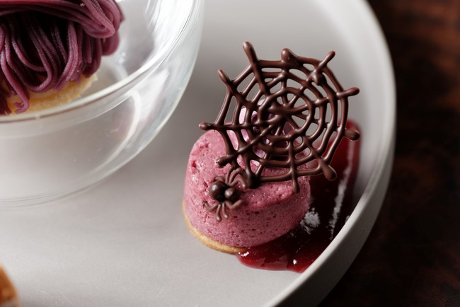 大人のハロウィンパーティーをイメージして、全体をブラック、レッド、パープルで統一したコースメニューを4日間限定でご用意いたします。ブラックは闇夜の影を、赤はブラッディなシーンを、パープルは月光を連想させ、見た目が奇妙で美しいことはもちろん、ブラックな食材にナイフを入れると意外な色が飛び出すなどのサプライズもお楽しみいただけます。食材にこだわり、食感や味の変化でも楽しめるランチとディナーのコースでハロウィンを盛り上げてみてはいかがでしょうか。