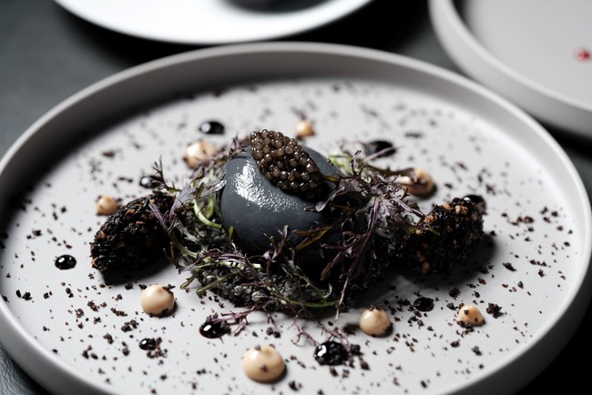 内容 : ・ポーチドエッグのブラックショーフロワ キノアとイカのタブレ トランペット茸のデュクセル