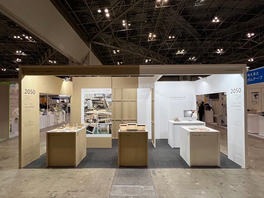 展示会場のブースは、新構法「再生板紙」で製作し、来場者にわかりやすいようにあえて半分壁紙を