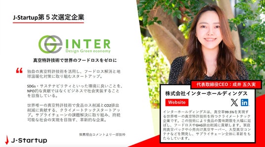 環境価値と経済価値が両立する社会を創る“Design Green economy”を掲げる株式会社インターホールディングス(所在地:東京都渋谷区、代表取締役社長CEO:成井五久実)は、経済産業省が運営するスタートアップ支援プログラム「J-Startup」の第5次選定企業に選出されたことをお知らせします。