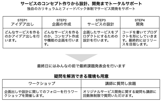 また、開発でつまづくことがないよう、回数無制限で講師へ質問できるほか、開発の各フェーズの要点を伝えるワークショップを開催します。