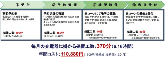 今までは、来場予定のEVユーザーから事前に電話予約を受け、コーンを設置するなどの作業が必要だったが、アプリ上で予約・決済が可能なプラゴバーの導入により半日の工数が削減できる。
