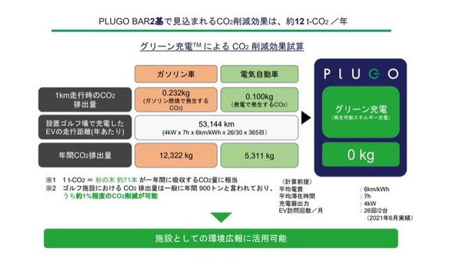 「地球規模の脱炭素社会の実現を目指す中、東名カントリークラブでもその小さな第一歩として、再生可能エネルギー事業者「PLUGO(プラゴ」の事前予約制EV充電器を2台設置しました。」