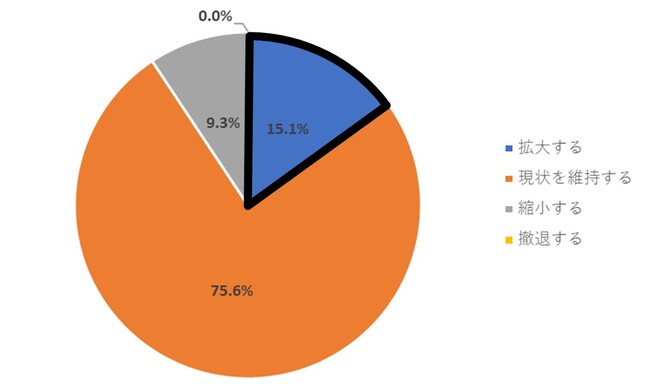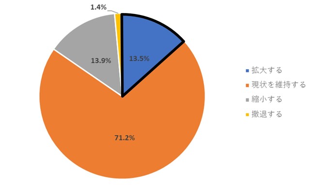 今後の事業展開の方向性に関する考えについて、「拡大する」は13.5%で2021年以降減少傾向にあることが判明。最多回答は「現状を維持する」で71.2%、「縮小する」は13.9%という結果に。また1.4%の中小/零細企業が「撤退する」と回答した。