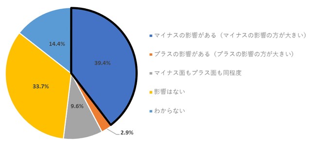 為替変動(円安)による事業への影響について、「マイナスの影響がある(マイナスの影響の方が大きい)」が最多の39.4%、「プラスの影響がある(プラスの影響の方が大きい)」は2.9%であった。その他、「マイナス面もプラス面も同程度」は9.6%、「影響はない」は33.7%、「わからない」が14.4%であった。