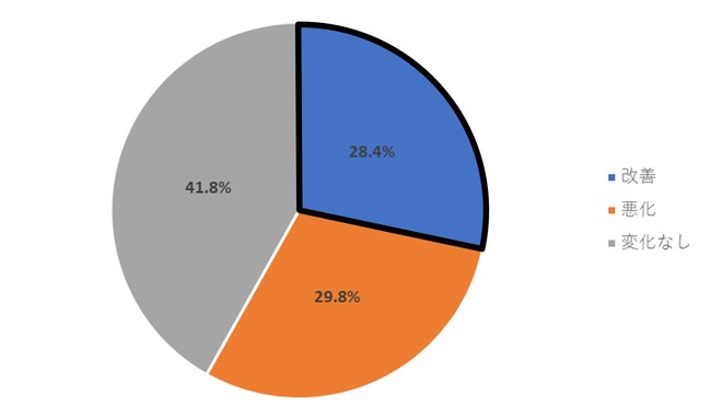 2022年度上期と営業利益を比較した際、「改善」したと回答した企業は全体の28.4%であり、2022年上期と比較して1.9ポイントの上昇が見られた。最多回答は「変化なし」で41.8%、「悪化」は29.8%であった。