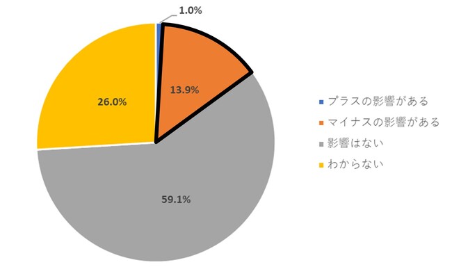 アメリカによる先端半導体技術の「対中輸出規制」による事業への影響について聞いたところ、13.9%が「マイナスの影響がある」と回答。「プラスの影響がある」は僅か1.0%であった。その他、「影響はない」が59.1%、「わからない」が26.0%であった。