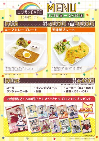 ここでしか味わえない限定コラボフードが登場!テイクアウトもOK。ニジガクCAFEのお会計1,500円(税込)ごとにオリジナルブロマイドをプレゼント。全12種コンプリートを目指そう!