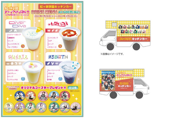ニジガクコラボのキッチンカーが初登場!限定ドリンクのご注文でオリジナルコースターをプレゼント。車体の写真撮影も忘れずに。