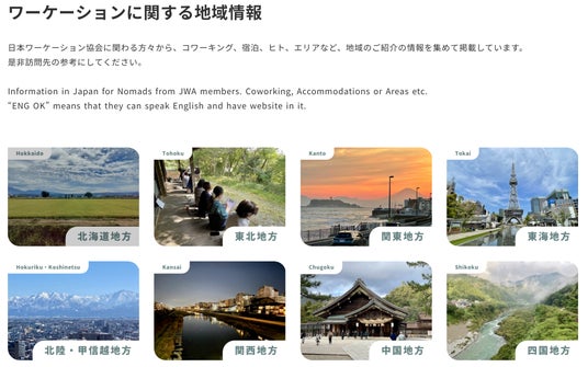 従来より、地域情報がまとまったサイトが欲しいという要望をいただいていたことから、日本ワーケーション協会ではホームページの「地域情報」を刷新し、会員より提供いただいた情報を地域ごとに掲載するページへ、現在リニューアルを進めています。
