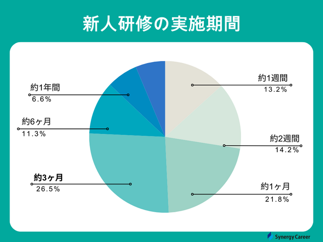 新人研修の実施期間で多かったのは、約3か月(30.4%)、約1か月(21.7%)だった。研修実施期間は約1~3か月間かけて行われることが主流であるとみられる。また、大手企業は平均90日間、中小企業は平均76日間で、大手企業の研修期間の方が長い傾向にある。