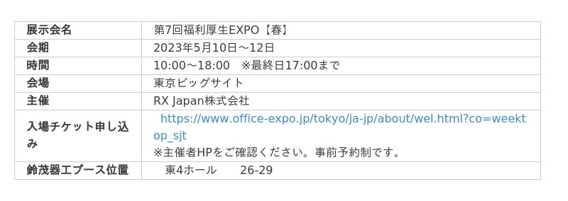 鈴茂器工株式会社(本社:東京都中野区、代表取締役社長:鈴木美奈子、以下 鈴茂器工)は、2023年5月10日(水)から12日(金)の3日間で第7回福利厚生EXPO【開催地:東京ビッグサイト】にこの度、初出展いたします。