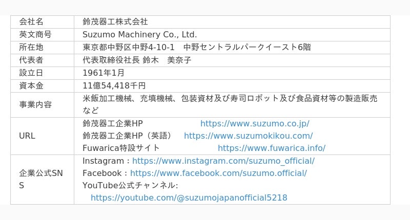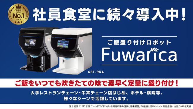 1981年に世界初の寿司ロボットを開発し、寿司の大衆化を実現したリーディングカンパニーです。米飯加工ロボットにおいて国内外で高いシェアを占め、お寿司、おにぎり、丼ものなど、世界中の様々な食のシーンで幅広く利用されています。近年では、ご飯盛り付けロボットシェアNo.1(出典:富士経済:「2022 年版 ワールドワイドロボット関連市場の現状と将来展望」 米飯盛付けロボット 販売金額・台数 2021 年実績)を獲得や、「Fuwarica(ふわりか) GST-MRA」が、「第25回外食産業貢献賞(日本食糧新聞社主催)」を受賞するなど、業界でも注目を集めております。『食の「おいしい」や「温かい」を世界の人々へ』を掲げ、細分化する食に関するニーズをいち早く捉えて市場にご提案し、常に新しいフードビジネスを開拓する企業として躍進しています。