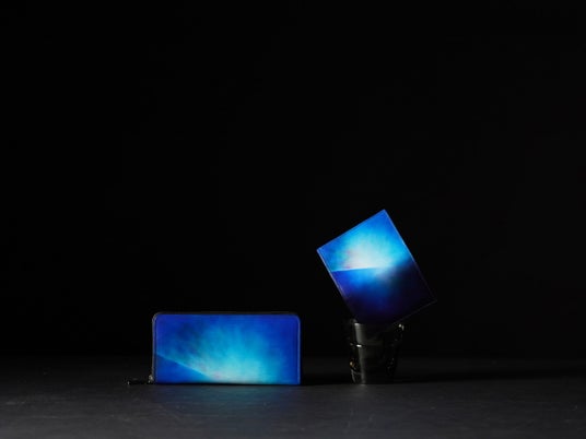 壮大な空を見上げる人魚姫の姿が物語の新たな始まりを想起させる、夏らしい爽やかな作品となりました。また、本企画のために制作されたコラボアイテムでは、メインビジュアルから受けたインスピレーションをもとに、yuhakuの染色職人がカラー制作を手掛けました。これまでのyuhakuにない新たな手法に挑戦し、まころん氏の描く蒼の世界をレザーアイテムの上に表現しました。