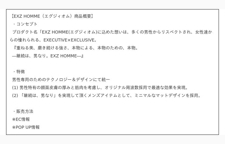 当社は「メンズパーソナルフェイシャルトレーニング」の重要性の発信を強化し、全ての男性に「さらに一つ上の男性へ」と進化を遂げていただくために開発した「EXZ HOMME(エグジィオム)」によるルーティントレーニングを継続頂きたいと願っております。