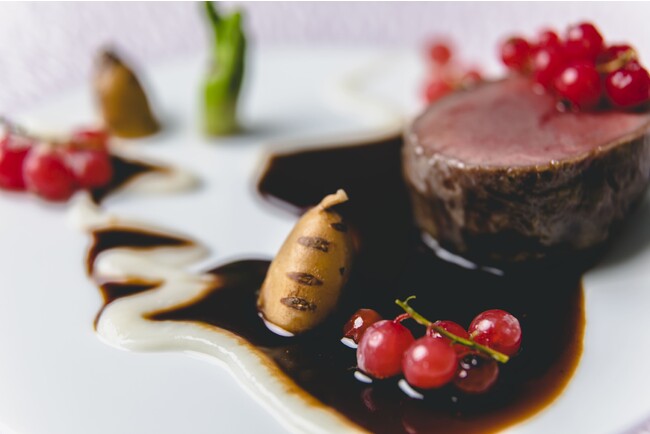 カリフラワーやホワイトアスパラガス、グリンピースといった冬の終わりから春の始まりの時期を代表する食材をコース全体に取り入れ、立春の時期にふさわしい春の訪れを感じさせるコースをお楽しみいただけます。メインの肉料理は滋味深い京丹波の鹿肉を。フレンチにおいて鹿肉に合わせられることが多い伝統的なソース、ソースグランヴヌールにダークチョコレートを加えることで、カカオの香りがほんのりとする、チョコレートの深みが加わった味わい深い一品に仕上げました。
