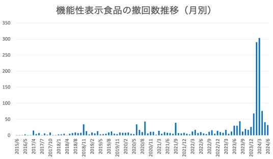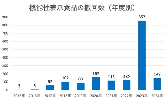 機能性表示食品の撤回数は2023年度に大きく増えました。科学的根拠についてチェックが入ったり、商品の販売が終了したりしたことが要因です。グラフでも突出した数字になっています。