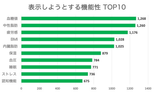 表示しようとする機能性に書かれてある効果やヘルスクレームは、血糖値・中性脂肪・疲労感・BMI・内臓脂肪などが人気です。