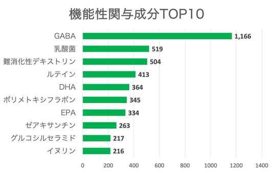 機能性関与成分では、変わらずGABAが人気です。表示できる機能性の種類が多く、多くの商品で使用されています。