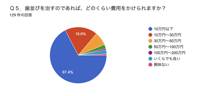 今回の調査で、約7割の人が自分の歯並びについて部分的・全体的に気になると回答しており、「歯並びを治すのであれば、どのくらい費用をかけられますか?」と尋ねると、最も多いのが「10万以下(67.4%)」、次いで「10~30万(18.6%)」、「30~50万(7.8%)」でした。10月に 行った20~30代の女性への歯並びに関する意識調査でも半数以上が「歯並びを治すのにかけられる費用は10万以下」と回答しています。