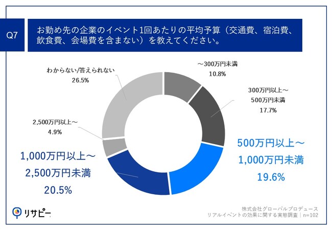 「Q7.お勤め先の企業のイベント1回あたりの平均予算(交通費、宿泊費、飲食費、会場費を含まない)を教えてください。」(n=102)と質問したところ、「1,000万円以上~2,500万円未満」が20.5%、「500万円以上~1,000万円未満」が19.6%という回答となりました。