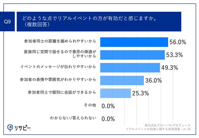 Q8で「リアルイベント」と回答した方に、「Q9.どのような点でリアルイベントの方が有効だと感じますか。(複数回答)」(n=75)と質問したところ、「参加者同士の距離を縮められやすいから」が56.0%、「直接同じ空間で話せるので意思の疎通がしやすいから」が53.3%、「イベントのメッセージが伝わりやすいから」が49.3%という回答となりました。