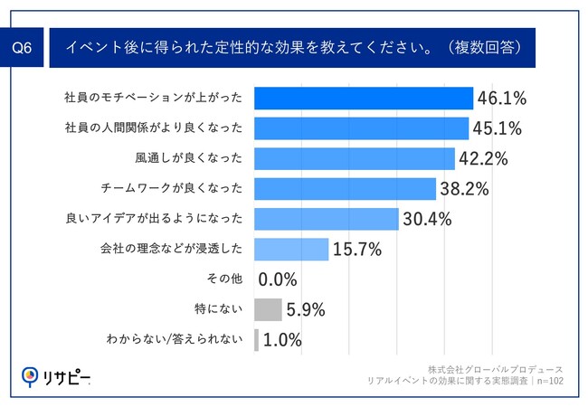 「Q6.イベント後に得られた定性的な効果を教えてください。(複数回答)」(n=102)と質問したところ、「社員のモチベーションが上がった」が46.1%、「社員の人間関係がより良くなった」が45.1%、「風通しが良くなった」が42.2%という回答となりました。