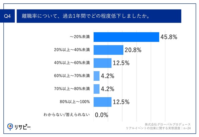 Q3で「離職率が低下した」と回答した方に、「Q4.離職率について、過去1年間でどの程度低下しましたか。」(n=24)と質問したところ、「~20%未満」が45.7%、「20%以上~40%未満」が20.8%という回答となりました。※なお、実施前の離職率からどの程度低下しているかを記載しています。