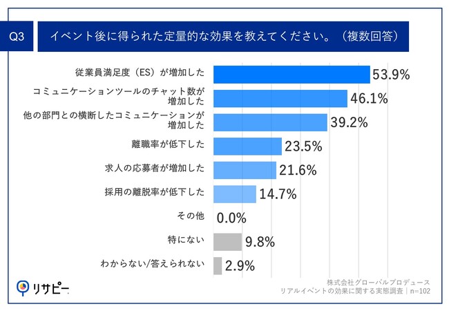 「Q3.イベント後に得られた定量的な効果を教えてください。(複数回答)」(n=102)と質問したところ、「従業員満足度(ES)が増加した」が53.9%、「コミュニケーションツールのチャット数が増加した」が46.1%、「他の部門との横断したコミュニケーションが増加した」が39.2%という回答となりました。