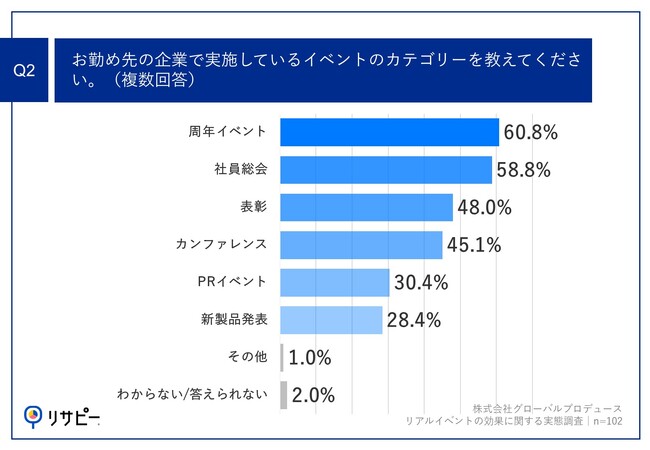 「Q2.お勤め先の企業で実施しているイベントのカテゴリーを教えてください。(複数回答)」(n=102)と質問したところ、「周年イベント」が60.8%、「社員総会」が58.8%、「表彰」が48.0%という回答となりました。