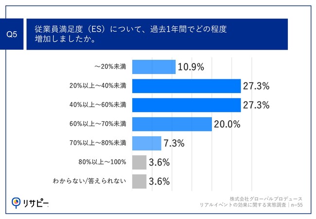 Q3で「従業員満足度(ES)が増加した」と回答した方に、「Q5.従業員満足度(ES)について、過去1年間でどの程度増加しましたか。」(n=55)と質問したところ、「~20%未満」が10.8%、「20%以上~40%未満」が27.3%、「40%以上~60%未満」が27.3%という回答となりました。※なお、実施前の従業員満足度(ES)からどの程度低下しているかを記載しています。